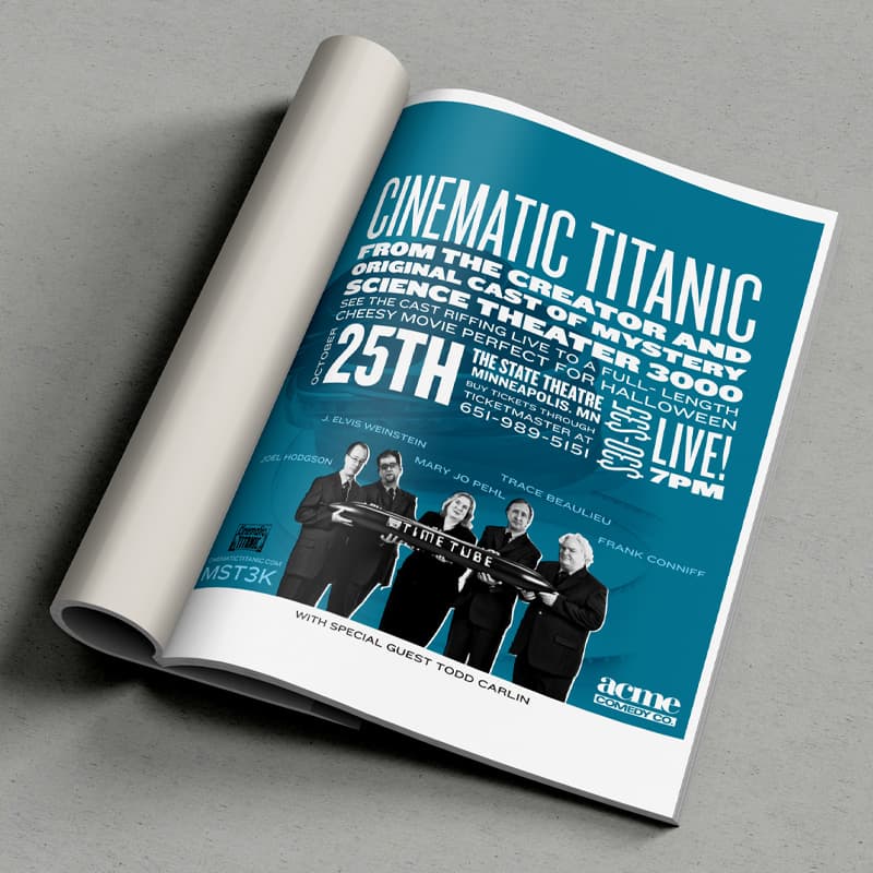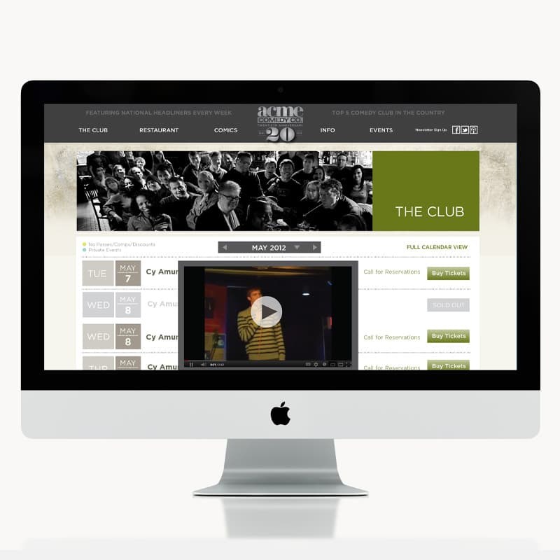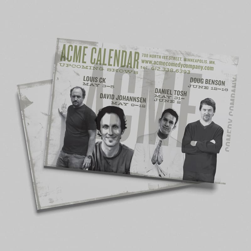 As a long-time fan of stand-up comedy, I had the opportunity to collaborate with the team at Acme Comedy Company. I proposed a strategic redesign of their website to feature a dynamic calendar of upcoming acts and highlight their “dinner and a show” experience. The new site significantly boosted ticket sales by streamlining event promotion and enhancing the customer online experience. This digital success led to a comprehensive rebrand, extending their refreshed identity across menus, business cards, signage, and promotional materials.